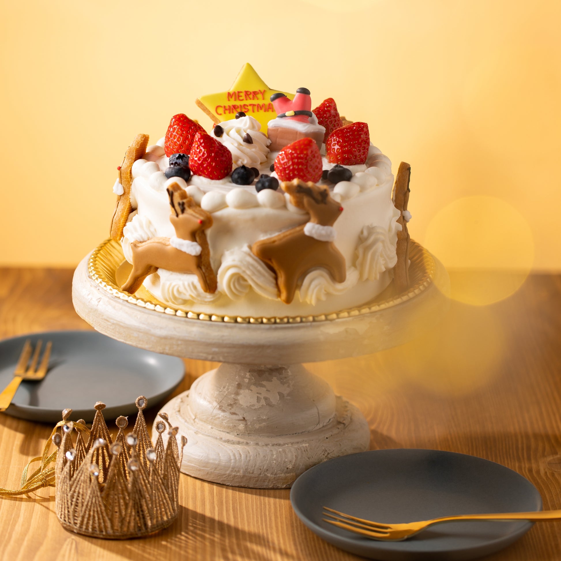 側面には風が吹くのを模したクリームにトナカイのアイシングクッキーがのり、